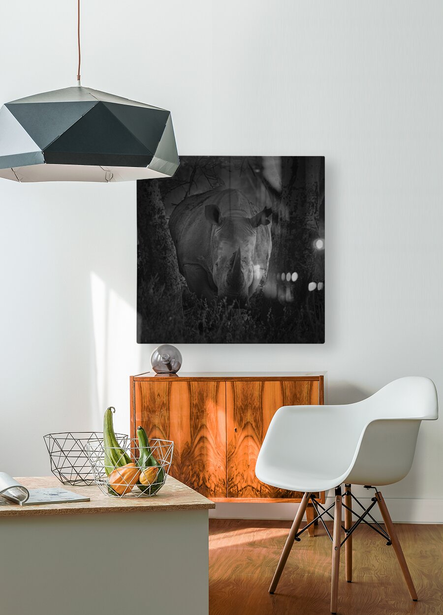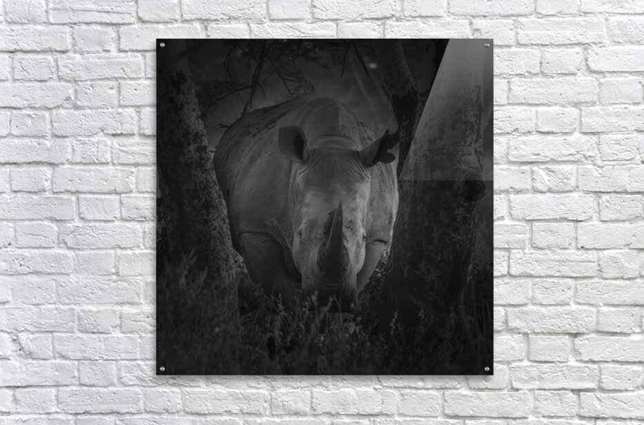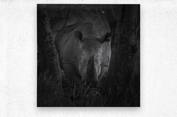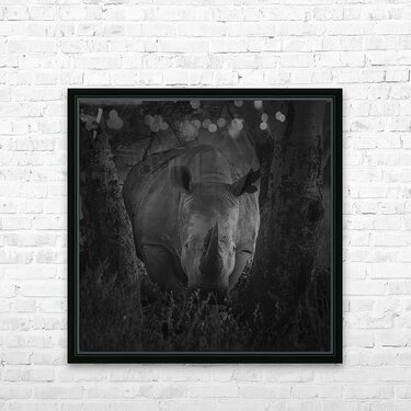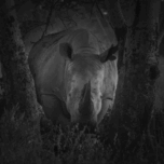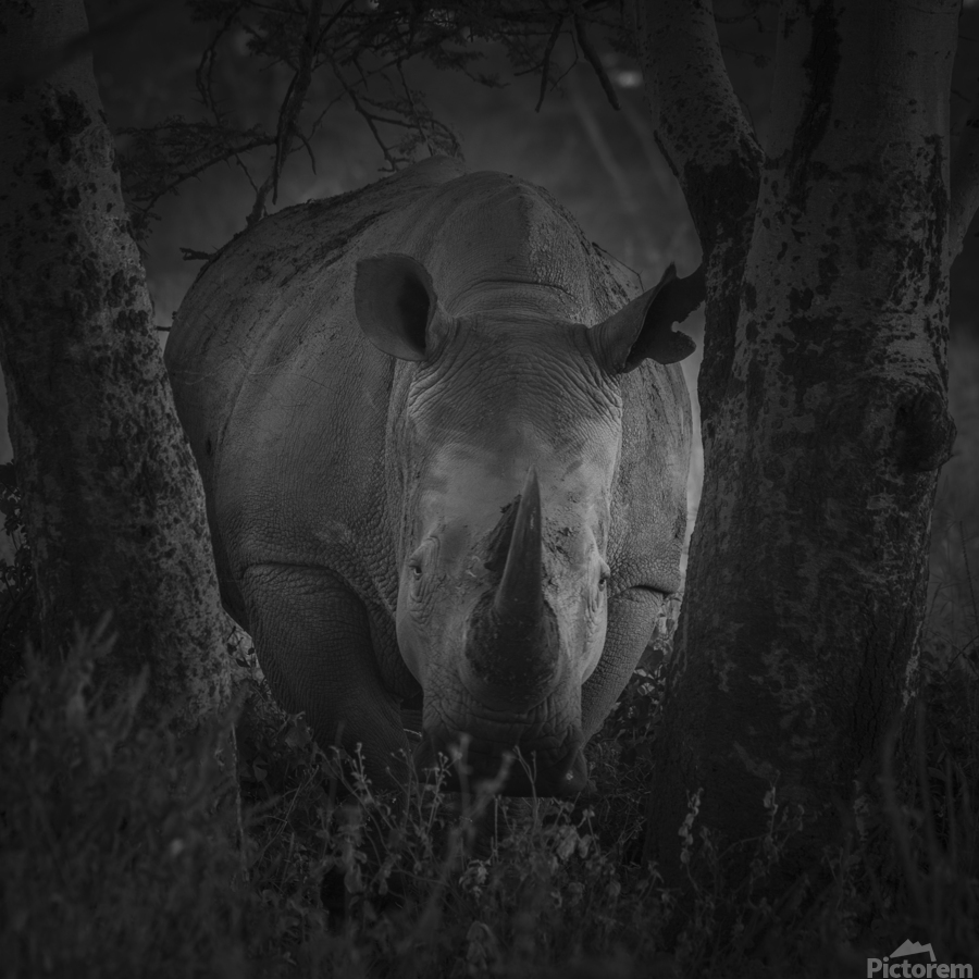 A rhinoceros stands between two trees in a dark, wooded setting, its horn prominently displayed. The black and white composition highlights the textur...[+]