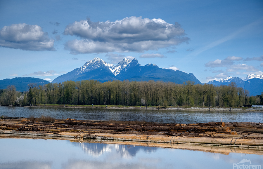Snow-capped mountains rise majestically in the background, with a serene river flowing beneath a cloudy sky. Logs float on the water's surface, surrounded by lush greenery lining the banks.
